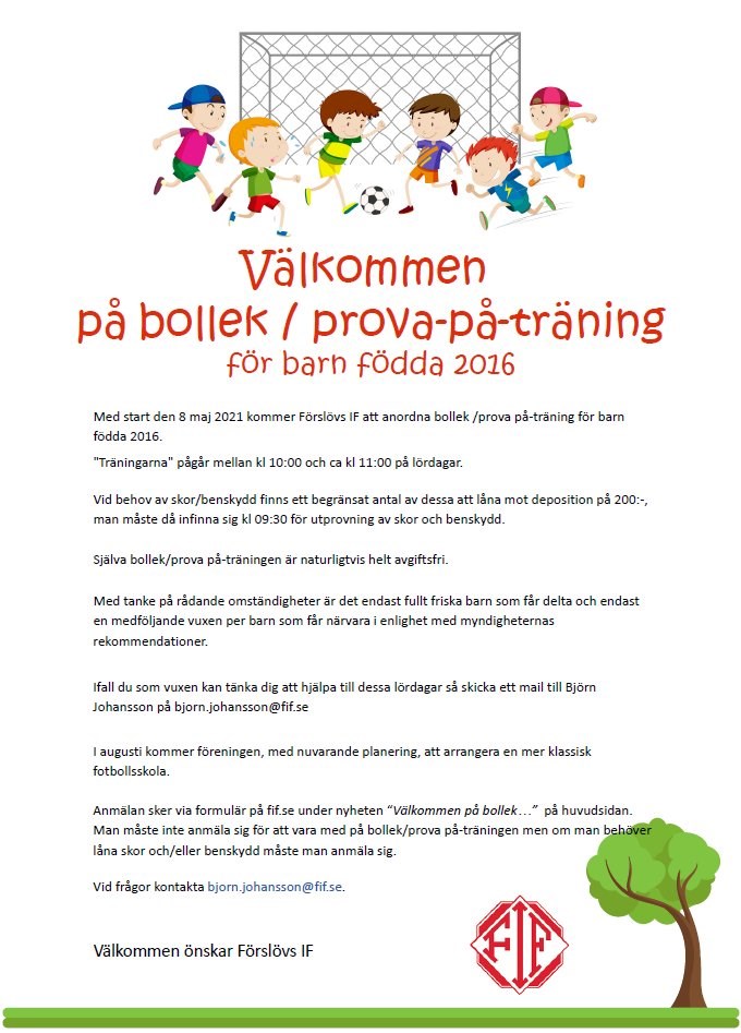 Alla barn födda 2016 är välkomna på Bollek/Prova-på träning i vår! Anmäl dig här!! Förslövs IF 28 apr 2021 0kommentarer