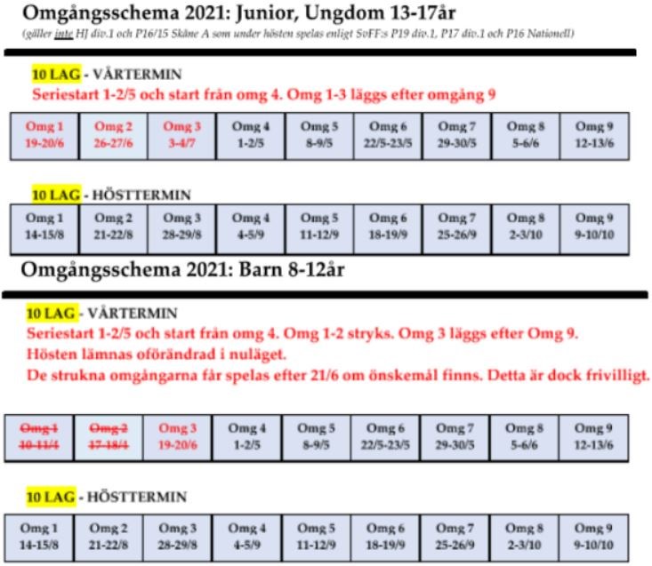 Pga Coronapandemin så har Skåneboll nu skjutit fram seriestarten för Ungdomsserierierna till den 1-2 maj. Sprid nyheten på era respektive lagsidor, denna nyhet går bara ut till ledare. Skånebolls dokument med de justerade spelomgångarna finns att hitta under dokument/ Säsong 2021 Nyheter på lagsidan för Ungdomssektionen. De nya omgångarna finns inlagda på fogis så ni kan redan nu logga in på fogis och justera efter era önskemål om matchers speldatum och matchstartstider. Vi återkommer och stämmer av slutgiltiga tider för matcher. Mvh Ungdomsledaresektionen